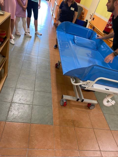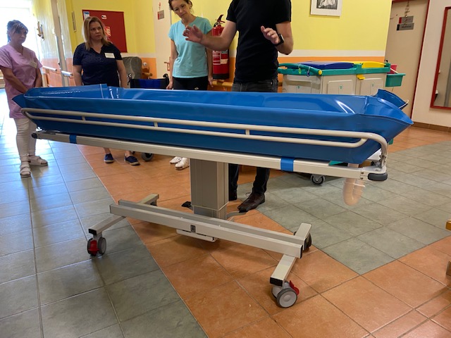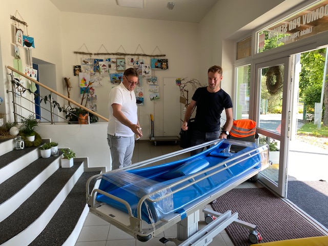 Zbrusu nová zdravotnická pomůcka, která výrazně pomáhá při péči o naše klienty byla dnes "spuštěna" do provozu. Sprchovací lehátko poskytují vysoký standard a komfortní a bezpečnou péči o osobní hygienu klientů se sníženou pohyblivostí i imobilních klientů. Staré a dosluhující lehátko už vyžadovalo značnou dávku improvizace zejména při jeho údržbě a již vykazovalo velké opotřebení způsobené dlouholetým náročným provozem při denním používání v péči o klienty.
